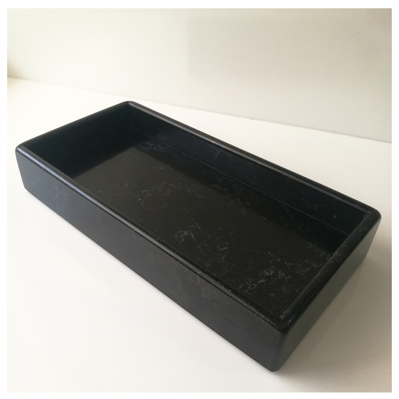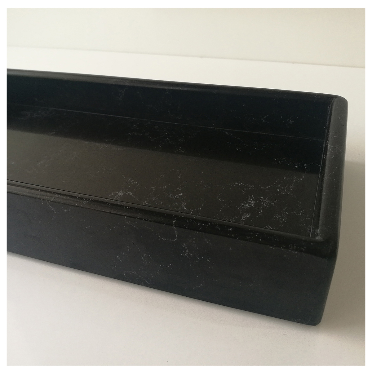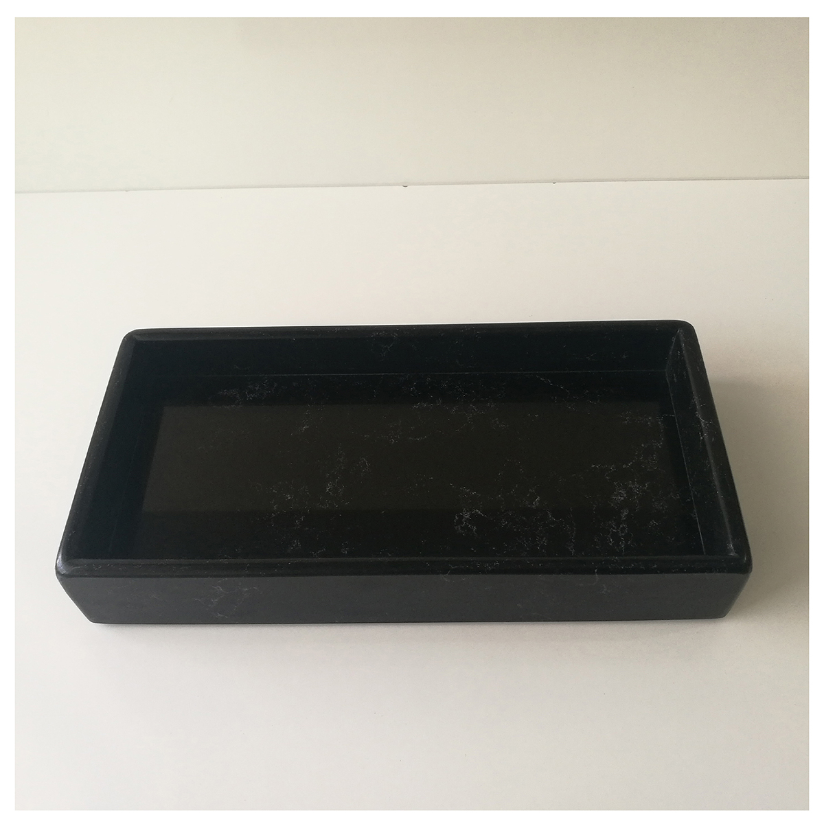 Siyah (gri damarlı) sunum tabağı 30 cm x 15 cm x 5 cm ölçülerinedir. Sunum tabağı, çimstone/kuvars'tan üretilmiştir. Ürünlerimiz doğal taş olduğu için renk tonu ve doku farklılıkları olabilir.